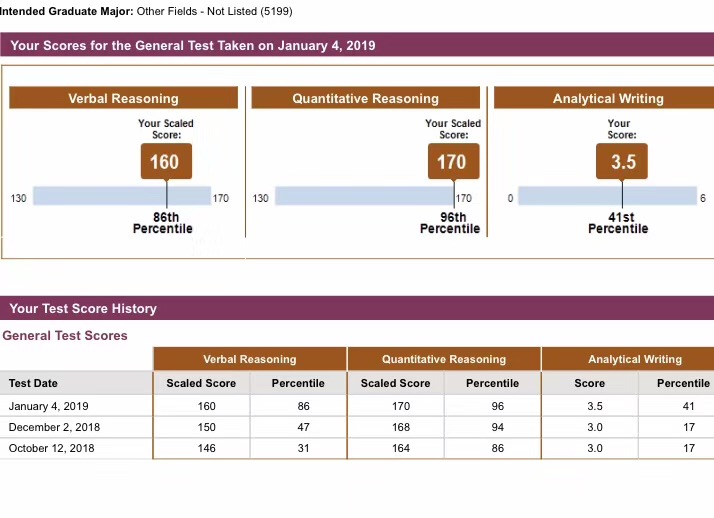 经过前两次的打击,我对于三战的目标仅仅是V153够我总分320+即可。考试时每道填空题都把它当做median,按逻辑来做,遇到看不懂的就mark一下马上跳过;而做阅读谨记解题步骤,利用排除法做题;数学稳扎稳打,多回头仔细检查。最后刺激的出分环节,看到成绩后我整个人激动得抖了一下,这一两个月的付出真的没有白费!
