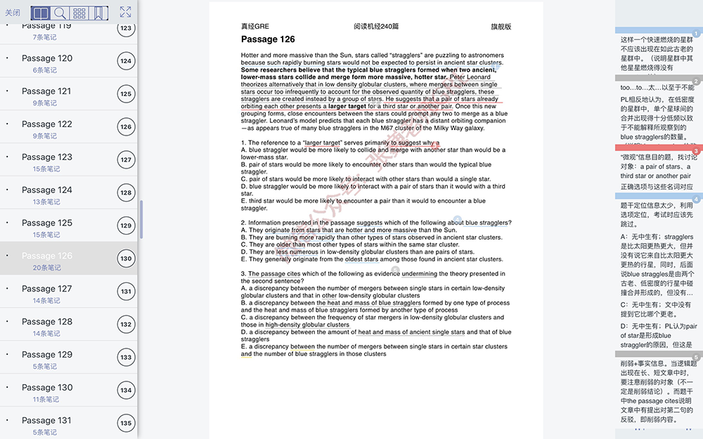 2、做完阅读一定要仔细分析!分析文章是非常重要的,我的阅读文档里的批注详细到题干对应的答案区间在哪、各个错误选项都错在哪、是正向还是反向等等,可以说不比老师们的解析少(小小地骄傲一下)。大概刷到一半以后,我几乎理解到了GRE的出题理念,定位和选答案快到飞起,所有的方法论已经形成条件反射。