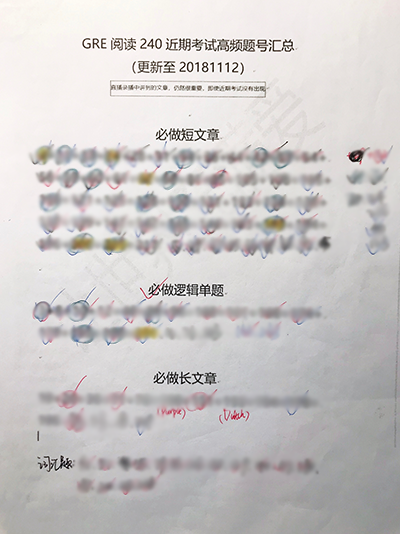 都说“老师领进门,修行靠个人”。班课结束之后,除了时不时看回放复习,我每天大概会写4个section的填空,并分析完。而阅读部分我则是优先刷完两遍高频题后,开始刷240篇的其余题目做为补充练习,每天刷十五篇左右并分析完。【后文有本人填空和阅读的分析方法介绍】数学则保持每天20-40道题目的练习,并且刷题班和数学难题小组都是比较难的新题目,通过这些练习来维持做题的感觉即可。(另外,近期的数学难题小组都是最新机经中较难的题目,我后期自己又复习了一两遍,确认自己写过的都会。)