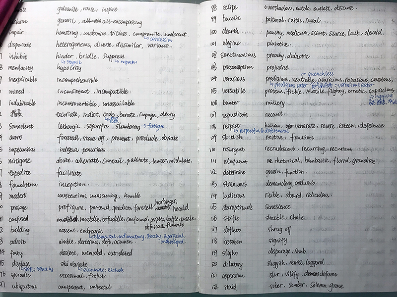 1、单词一定是填空的基础,填空和背单词结合的方法最好。ETS爸爸很狡猾,一些有一词多义的单词一定要多查韦氏词典,同时积累下来。利用APP背三千虽然有科学的艾宾浩斯记忆曲线,但是准确的英文释义要多翻书。我的三千书前前后后也翻了几乎三遍,写了很多笔记