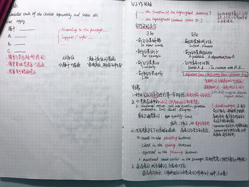 1、把老师的方法融入骨髓,结合自己的能力,形成自己的做题逻辑。小可爱老师的冲分班我大概看了三遍,刷题班看了两遍,在做题时已经完全不方了。小可爱的一些经典语录,比如“读主旨时我们不要读句子的枝干而是读主干,因为有以偏概全给我们做强烈的支撑”、“做多选题的时候,如果从定位句中看到有并列关系,可以预估一下答案可能有两个”、“比较关系和因果关系的无中生有”、“qualify有99.9%的可能是正确选项”等,这些干货直接成为我考试时的必杀技,尤其是在遇到读不懂的文章也能通过这些方法排除掉错误选项。
