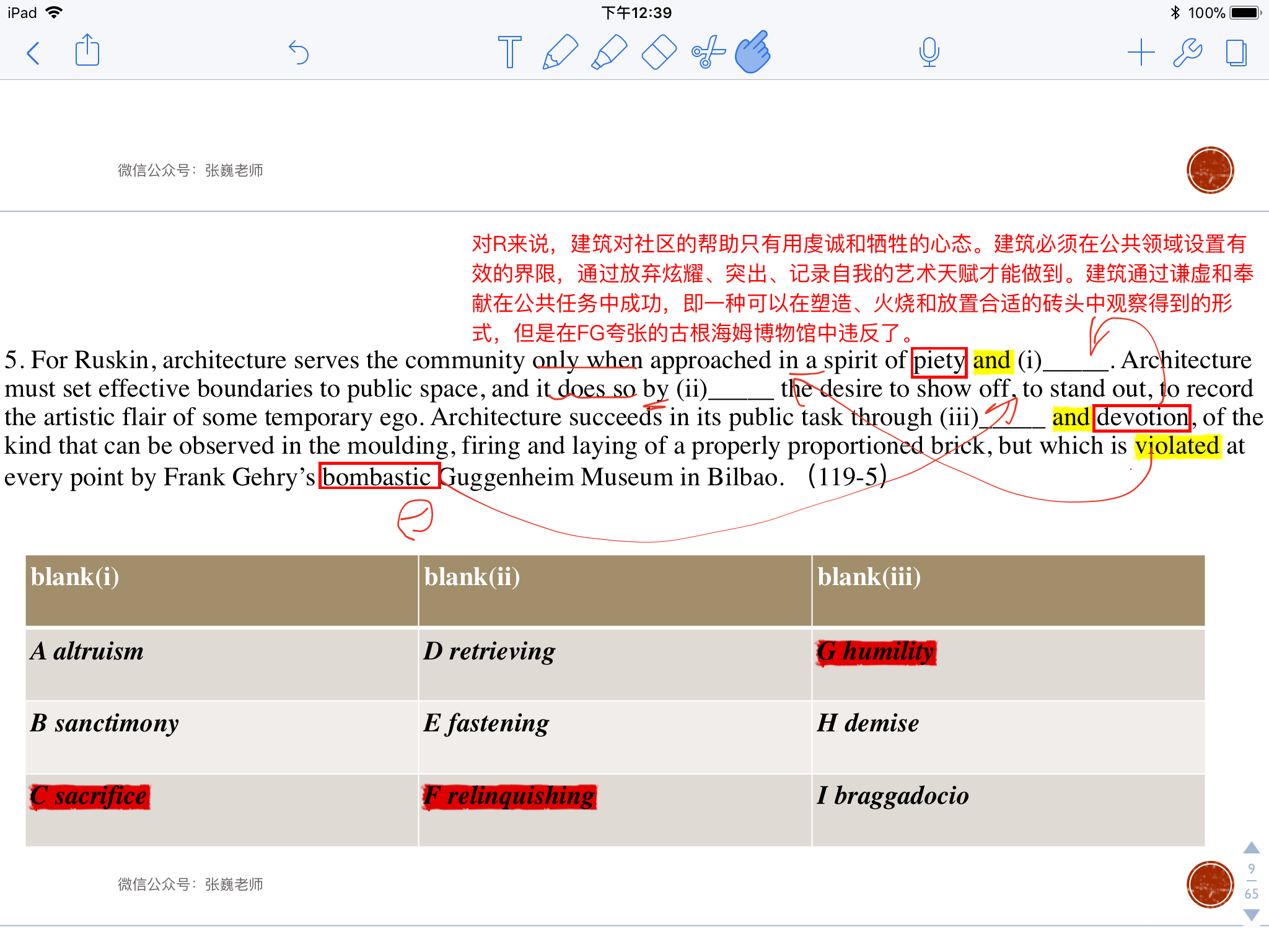 3、六选二是填空部分的送分题!我的方法是在做六选二时,先看选项,大致预估出选项出现了哪些同义词,然后再读题目找到题目中的强词,最后根据逻辑关系来选择是与强词取同还是取反。同时,平时背单词积累的同义词很重要,等价词小组的资料我看了四五遍并且把自己记忆模糊的都摘录下来,结合自己做题的积累,形成了自己的等价词总结。