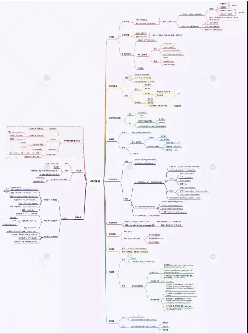 关于不同题型的选择,课上也是有一套“见招拆招”的方法论,换言之就是碰到什么题型用什么方法来定位、解题等。根据老师要求,我也整理了一份思维导图,便于查看,见下图。个人认为这样类似数学公式的方法论帮助颇多,因为即使是文章内容千变万化,但是题型也就是这些,GRE的出题套路也万变不离其宗。同样,阅读的错题复盘也很重要,每次出错都要对着这些逻辑公式问自己,是没有识别出题型还是具体解题哪个步骤出现了失误?长期坚持下去,成效显著。