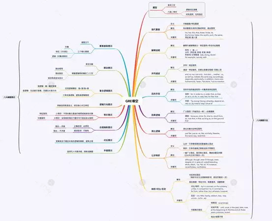 填空和阅读各10题组成了一个完整的V section。但是就我个人而言,填空的难度要小于阅读。但这个难度小是建立在单词熟悉和方法论掌握得当的基础上。单词的准备要点已在上文写出。方法论上,我就按照GRE博哥的方法来。上完课后,我将其整理成了一张思维导图,方便查看,如下图。